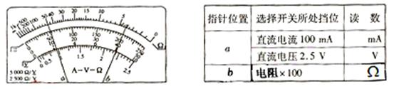 (2009年高考试题安徽卷第21小题)Ⅰ. (6分)用多用电表进行了几次测量,指针分别处于a、b的位置,如图所示。若多用电表的选择开关处于下面表格中所指的档位,a和b的相应读数是多少?请填在表格中。