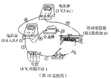 (2009年高考试题江苏卷第10小题II)测量该合金棒电阻的实物电路如图丙所示(相关器材的参数已在图中标出)。该合金棒的电阻约为几个欧姆。图中有一处连接不当的导线是__________.(用标注在导线旁的数字表示)