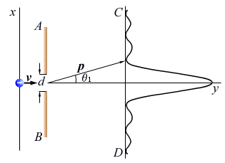 如下图所示,设有一束电子,以速度v沿y轴射向AB屏上的单缝,缝宽为d,在屏幕CD上得到衍射图样,衍射的第一极小角为q1 ,则![]()