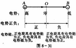 点评:关于电势的正负与电势的高低参看下图8一31所示,A、B带等量的异种电荷,AO区间是正电荷形成的电场,OB区间是负电荷形成的电场.