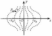 [例8]北京静电透镜是利用静电场使电子束会聚或发散的一种装置,其中某部分静电场的分布如下图所示。虚线表示这个静电场在xoy平面内的一簇等势线,等势线形状相对于ox轴、oy轴对称。等势线的电势沿x轴正向增加,且相邻两等势线的电势差相等。一个电子经过P点(其横坐标为-x0)时,速度与ox轴平行。适当控制实验条件,使该电子通过电场区域时仅在ox轴上方运动。在通过电场区域过程中,该电子沿y方向的分速度vy随位置坐标x变化的示意图是( D )