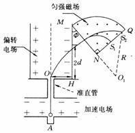 32.(09·重庆·25)如题25图,离子源A产生的初速为零、带电量均为e、质量不同的正离子被电压为U0的加速电场加速后匀速通过准直管,垂直射入匀强偏转电场,偏转后通过极板HM上的小孔S离开电场,经过一段匀速直线运动,垂直于边界MN进入磁感应强度为B的匀强磁场。已知HO=d,HS=2d,