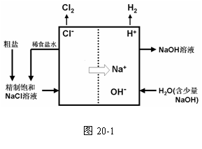 ②电解生产主要过程(见图20-1):NaCl从阳极区加入,H2O从阴极区加入。阴极H+ 放电,破坏了水的电离平衡,使OH-浓度增大,OH-和Na+形成NaOH溶液。