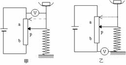 导示:从图上可以看出,随着重力的增加,弹簧就要缩短,带着指针下移,电路发生变化,电压表读数也相应变化,从电压表的读数就可以知道重力的大小。甲图的电压表是测量ap电阻之间的电压U1。U1:E=x1:L,G1=kx1。乙图的电压表是测量bp电阻之间的电压U2。U2:E=(L-x2):L,G2=kx2。所以各小题参考答案:(1)甲:0,乙:E。(2)甲:G=kL/E,乙:G=kL(E-U)/E。(3)甲好,重力与电压表示数成正比,表的刻度均匀。(4)重力太小读不出;重力太大超出量程。