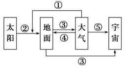 下图中各箭头及序号表示太阳、地面、大气、宇宙空间之间的热力作用,其中包括太阳辐射、地面辐射、大气辐射、大气逆辐射、大气的削弱作用(吸收、反射和散射),读图回答1-2题。