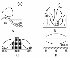 解析:选B。白天时,陆地增温快,气压低,海洋增温慢,气压高,近地面风从海洋吹向陆地;夜晚山坡降温快,空气会由山坡流向谷地,形成山风;城市的气温一般高于郊区,城市处会形成上升气流;冷却的地方,近地面气压偏高,等压面应向上弯曲。