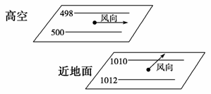 解析:图中5100米-5800米是北半球500百帕等压面上的等高线,根据等压面上等高线与等高面上的等压线之间的一致性关系,可读出该高空水平面上气压分布是:南部气压高、北部气压低;又因在5 000米左右的高空,摩擦力很小,故在水平气压梯度力和地转偏向力的作用下形成西北风。