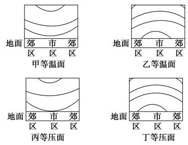 解析:选B。受城市热岛效应的影响,市区的气温比郊区高,气压比郊区低,故市区等温面向上凸、等压面向下凹。