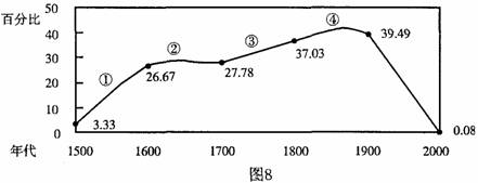 下列对图8反映的世界殖民地占全球陆地(南极洲除外)面积的比例(%)变化的解读,不正确的是 (
