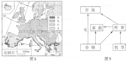 图8为欧洲四种农业地域类型分布图,图9是该区域某种农业地域类型的经营方式示意图。读图回答14-16题。