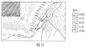 图11是我国西部某地区略图,图中左上方所示为当地铁路沿线的草方格沙障。读图回答21-22题。
