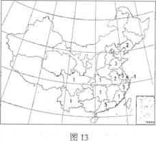 《中国城市竞争力报告》依据居住环境、生态环境等14项指标,对我国200个城市2006年度宜居状况做了评估。图13中数字是前30名的城市在各省级行政区的分布个数。读图回答25-26题。