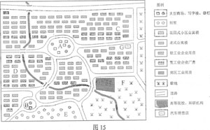 某城市内部的地域结构为多核心结构。图15是该城市的建筑与道路分布示意图。