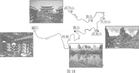 C.[旅游地理]小王参加了“重走霞客路”的旅行考察活动。他们从湖北武当山出发,到云南丽江结束。图18是考察路线示意图及相关景观图。读图回答下列问题。(10分)