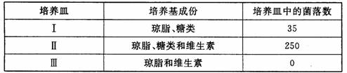 9.在I、II、Ш三个培养皿中,加入不同成份的培养基,分别接种等量的大肠杆菌,置于适宜条件下培养一段时间后,统计各培养皿中的菌落数(见下表)。