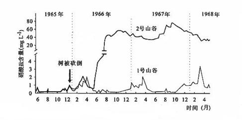 为研究森林群落在生态系统物质循环中的作用,美国一研究小组在某无人居住的落叶林区进行了3年实验。实验区是两个毗邻的山谷(编号1、2),两个山谷各有一条小溪。1965年冬,研究人员将2号山谷中的树木全部砍倒留在原地。通过连续测定两条小溪下游的出水量和硝酸盐含量,发现2号山谷小溪出水量比树木砍倒前升高近40%。两条小溪中的硝酸盐含量变化如图所示。