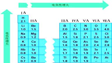 3、电负性 (1) 键合电子:元素相互化合时,原子中用于形成化学键的电子称为键合电子 孤电子:元素相互化合时,元素的价电子中没有参加形成化学键的电子的孤电子。 (2)定义:用来描述不同元素的原子对键合电子吸引力的大小。 (3)意义:元素的电负性越大,表示其原子在化合物中吸引电子的能力越强;反之,电负性越小,相应原子在化合物中吸引电子的能力越弱。 (4) 电负性大小的标准:以F的电负性为4.0和Li的电负性为1.0作为相对标准。 (6) 元素电负性的应用 1 元素的电负性与元素的金属性和非金属性的关系 2 电负性与化合价的关系 ③判断化学键的类型 4对角线规则:元素周期中处于对角线位置的元素电负性数值相近,性质相似。 |