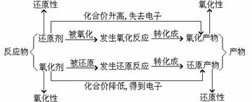 二、氧化还原反应 1、概念:(1)氧化反应及还原反应 失电子→化合价升高→ 氧化反应,如 C→CO2 得电子→ 化合价降低→ 还原反应,如CuO→Cu (2)氧化剂及还原剂 失电子物质-还原剂。 得电子物质-氧化剂。 (3)氧化产物-被氧化得到的产物。还原产物-被还原得到的产物。 2、氧化还原反应的特征:反应前后元素的化合价发生了变化。 氧化还原反应的实质:电子的转移(得失或偏移) 失电子(或电子对偏离)→化合价升高→氧化反应 得电子(或电子对偏向)→化合价降低→还原反应 ↓ ↓ ↓ (本质) (特征) (反应) 3、氧化还原反应与四种基本反应类型的关系。 |