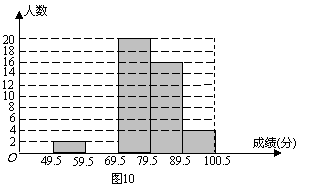 33. (2009益阳)某校数学兴趣小组成员小华对本班上期期末考试数学成绩(成绩取整数,满分为100分)作了统计分析,绘制成如下频数、频率分布表和频数分布直方图(图10). 请你根据图表提供的信息,解答下列问题: