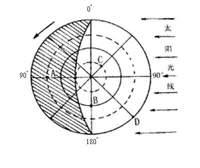 (共11分)读“太阳光照射地球示意图 ”(图中阴影部分表示黑夜、箭头表示地球的自转方向、虚线表示极圈和回归线),回答下列问题。
