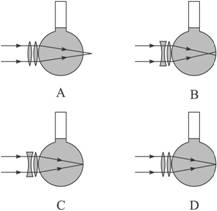 10.在探究近视眼视力矫正问题时用图2的装置模拟眼睛,烧瓶中的着色液体相当于玻璃体,烧瓶左侧紧靠瓶壁的凸透镜相当于晶状体,右侧内壁相当于视网膜。图3中的四幅图是一些同学描绘近视眼矫正的方法和光路,其中能达到近视眼矫正目的的是