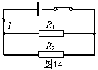 (6分)在图14所示的电路中,电阻R1的阻值是5Ω,干路中的电流I是0.5A,电阻R2两端的电压是2V。求: