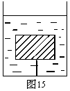 (7分)如图15所示,容器中装有水,水中有一个木块被细线系着,已知水重200N,水深为0.5m,木块的体积为4dm3,木块的密度为0.6×103kg/m3,试求: