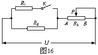 33.(6分)如图16所示,R1=400Ω,R3的变阻范围是0~20Ω,电源电压U保持12V不变。