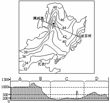 (14分)右图为我国东北地区等气温年较差(年较差指最高月平均气温与最低月平均气温之差)分布图和沿满洲里--绥芬河一线的地形剖面图,读图回答: