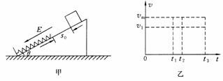 (3)从滑块静止释放瞬间开始计时,请在乙图中画出滑块在沿斜面向下运动的整个过程中速度与时间关系v-t图象。图中横坐标轴上的t1、t2及t3分别表示滑块第一次与弹簧上端接触、第一次速度达到最大值及第一次速度减为零的时刻,纵坐标轴上的v1为滑块在t1时刻的速度大小,vm是题中所指的物理量。(本小题不要求写出计算过程)
