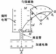 32.(09·重庆·25)如题25图,离子源A产生的初速为零、带电量均为e、质量不同的正离子被电压为U0的加速电场加速后匀速通过准直管,垂直射入匀强偏转电场,偏转后通过极板HM上的小孔S离开电场,经过一段匀速直线运动,垂直于边界MN进入磁感应强度为B的匀强磁场。已知HO=d,HS=2d,