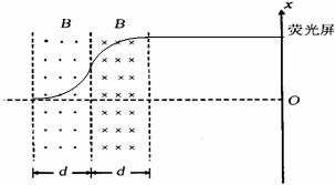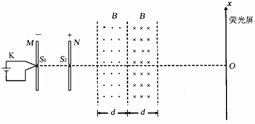 4. (2005江苏物理·17 ) 如图所示,M、N为两块带等量异种电荷的平行金属板,S1、S2为板上正对的小孔,N板右侧有两个宽度均为d的匀强磁场区域,磁感应强度大小均为B,方向分别垂直于纸面向外和向里,磁场区域右侧有一个荧光屏,取屏上与S1、S2共线的O点为原点,向上为正方向建立x轴.M板左侧电子枪发射出的热电子经小孔S1进入两板间,电子的质量为m,电荷量为e,初速度可以忽略.
