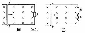 12(2009届江苏靖江市高三月考)如图,甲、乙两图为与匀强磁场垂直放置的两个金属框架,乙图除了一个电阻为零、自感系数为L的线圈外,其他部分与甲图都相同,导体AB以相同的加速度向右做匀加速直线运动。若位移相同,则( A )