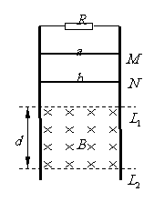 16 (2009年江苏盐城市高三上学期月考)如图所示,电阻忽略不计的、两根两平行的光滑金属导轨竖直放置,其上端接一阻值为3Ω的定值电阻R。在水平虚线L1、L2间有一与导轨所在平面垂直的匀强磁场B,磁场区域的高度为d=0.5m。导体棒a的质量ma=0.2kg、电阻Ra=3Ω;导体棒b的质量mb=0.1kg、电阻Rb=6Ω,它们分别从图中M、N处同时由静止开始在导轨上无摩擦向下滑动,且都能匀速穿过磁场区域,当b 刚穿出磁场时a正好进入磁场.设重力加速度为g=10m/s2。(不计a、b之间的作用)求: