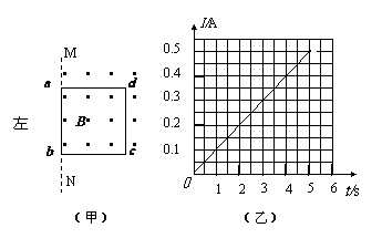 18(2009年北京石景山区高三上学期期末)如图(甲)所示,边长为L=2.5m、质量m=0.50kg的正方形绝缘金属线框,平放在光滑的水平桌面上,磁感应强度B=0.80T的匀强磁场方向竖直向上,金属线框的一边ab与磁场的边界MN重合.在力F作用下金属线框由静止开始向左运动,在5.0s内从磁场中拉出.测得金属线框中的电流随时间变化的图象如图(乙)所示.已知金属线框的总电阻为R=4.0Ω.