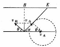如图6所示,设船头v船与河岸成θ角。合速度v与河岸成α角。可以看出:α角越大,船漂下的距离x越短,那么,在什么条件下α角最大呢?以v水的矢尖为圆心,v船为半径画圆,当v与圆相切时,α角最大,根据![]()