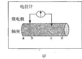 (1)神经纤维处于静息状态时,把电位计的一个微电极接到轴突膜表面,另一个插到轴突膜内表 面(如图甲),电位计的指针有什么变化?▲。若规定细胞膜外表面为零电位,则细胞膜内表 面的电位称为静息电位,产生静息电位的主要原因是▲透过细胞膜向外扩散比▲向内扩散更容易。