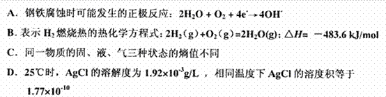 [解析]选B。A项,钢铁发生吸氧腐蚀时,正极反应为2H2O+O2+4e-===4OH-;B项,表示H2燃烧热时,应是H2生成稳定化合物液态H2O的热化学方程式;C项,同一物质固、液、气三种状态的熵值依次增大;D项,AgCl饱和溶液中Ag+、Cl-的物质的量浓度为1.92×10-3÷108 mol· L-1=1.8×