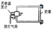如图所示,厚壁容器的一端通过胶塞插进一只灵敏温度计和一根气针,另一端有个用卡子卡住的可移动胶塞。用打气筒慢慢向筒内打气,使容器内的压强增加到一定程度,这时读出温度计示数。打开卡子,胶塞冲出容器后 ( )