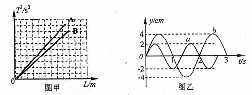 (4)两个同学利用假期分别去参观北京大学和香港大学的物理实验室,各自在那里利用先进的DIS系统较准确地探究了“单摆的周期T与摆长L的关系”,它们通过校园网交换实验数据,并由计算机绘制了T2~L图象,如图甲所示。去北京大学的同学所测实验结果对应的图线是 (选填“A”或“B”)。另外,在香港大学的同学绘制了在同一地点做的两种单摆的震动图象,如图乙所示,则两单摆摆长之比La/Lb= 。