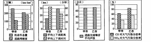 资料:随着城市人口数量的增加,甲乙两城市因交通拥挤造成的污染问题日益突出。甲城市地面公交运力不足,出租车和私家车数量猛增;乙城市加强地面公交和地铁的发展,公共交通在城市交通中的比重大于甲城市,但是存在着地面公交与轨道交通线路重复的现象。