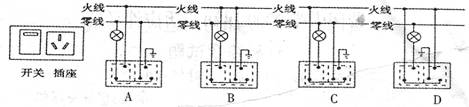 20. 家庭电路中需要安装一个“一开三孔”开关(即一个开关和一个三孔插座连在-起)要求插座能单独使用,开关能控制电灯且符合安全用电原则,从实物正面观察,如图所示的几种接线中符合要求的是( ) ![]()