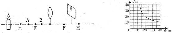 28. 某同学在探究凸透镜成像规律的实验中,他首先按下图左所示完成仪器装配,图中H点是2倍焦距处。经过调节,在光屏上得到了一个清晰的像,但像的位置偏高,为了使像能成在光屏的中央,应把蜡烛向______(选填“上”或“下”)调;调节好蜡烛的高度后,记录并绘制了物体到凸透镜的距离u跟像到凸透镜的距离v之间关系的图像(下图右),该凸透镜的焦距是______。他把蜡烛移到A点处,此时光屏上的像很模糊,为了得到清晰的像,应把光屏向______(填“左”或“右”),这次成的是倒立、______的实像。![]()
