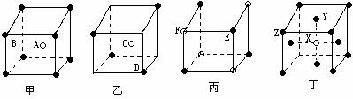 [例6]现有甲、乙、丙、丁四种晶胞(如图所示),可推知:甲晶体中A与B的离子个数比为 ;乙晶体的化学式为 ;丙晶体的化学式为______;丁晶体的化学式为______。