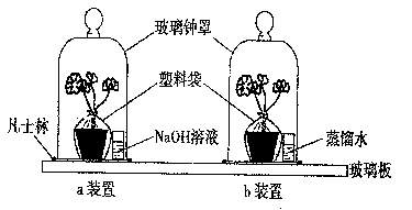 13.下图为探究CO2是否为植物光合作用原料的实验装置示意图。其中a为实验装置,b为对照装置。有关用塑料袋扎紧花盆的实验