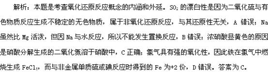 强氧化性可以和Cu在加热条件下发生剧烈反应 ,C错误;将SO2通入品红溶液,溶液褪色,是生成了不稳定的物质,受热分解后又恢复原色。将SO2通入溴水,发生氧化还原反应,溴水褪色后加热不能恢复原色,D错误。答案为A。