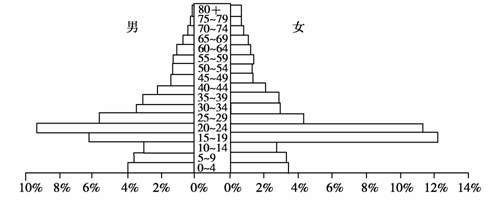 解析:选B。由图中可看出,老人、中年人和儿童段人口金字塔变化趋势正常,15-29岁的人口比重明显增多,说明这种现象是大量外来劳动力涌入造成的。