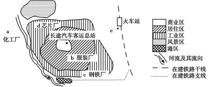 读江汉平原某城市空间结构示意图(北部为新兴工业区,南部为传统工业区),回答8-9题。