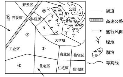 解析:第10题,N附近有科研所和大学城,并且环境好,故最适宜建设高新技术区。第11题,①处邻近商业区和住宅区,最适合建大型超市。