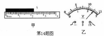14.如图甲 所示木块A 的长度是_______cm。图乙中电压表的示数为:_______V.![]()